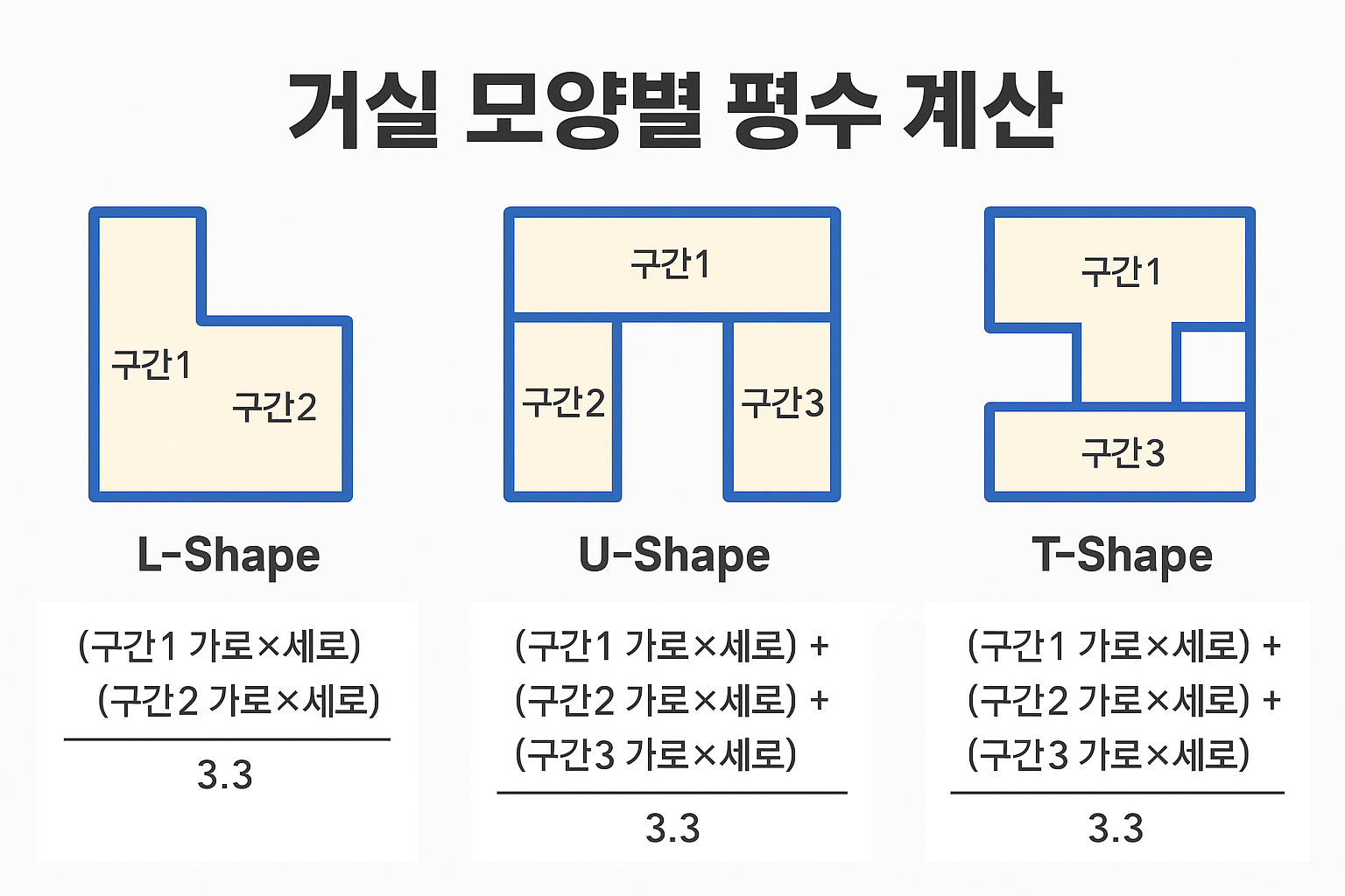 방은 가로×세로÷3.3으로 쉽게 평수를 구할 수 있지만, 거실은 직사각형이 아니고 주방과 연결된 경우도 많아 계산이 헷갈립니다. 오늘은 거실 모양별 평수 계산법을 그림과 함께 정리해 드리겠습니다.