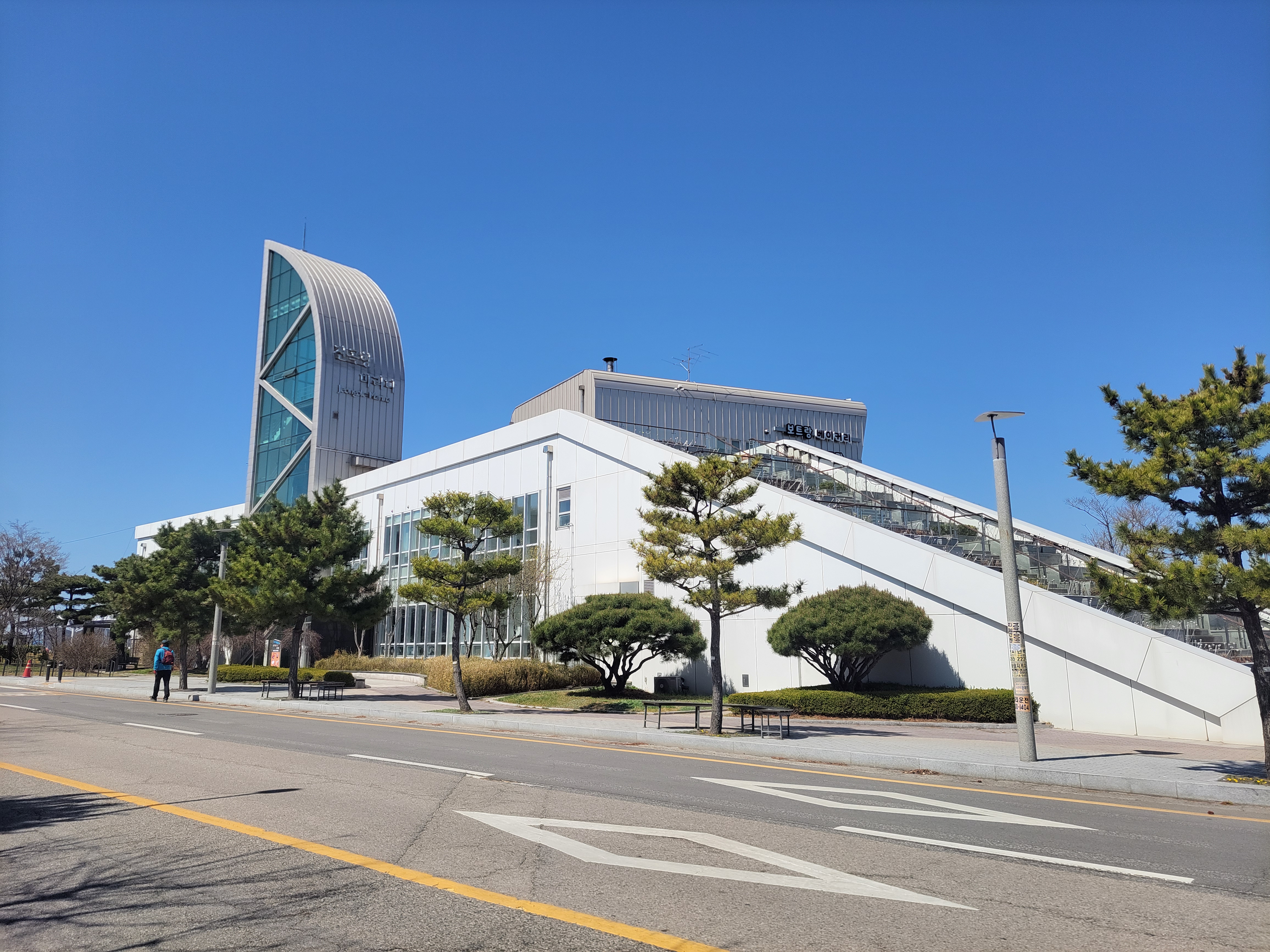 특히 건물 상부로 이어지는 사선 구조와 타워 디자인은 사진으로 볼 때보다 현장에서 훨씬 인상적입니다. 하늘이 맑은 날에는 건물의 선이 더 또렷하게 살아나고, 전체적인 색감도 시원하게 보여서 첫인상이 좋았습니다. 건축 디자인 자체가 이 공간의 상징처럼 느껴질 정도였습니다.