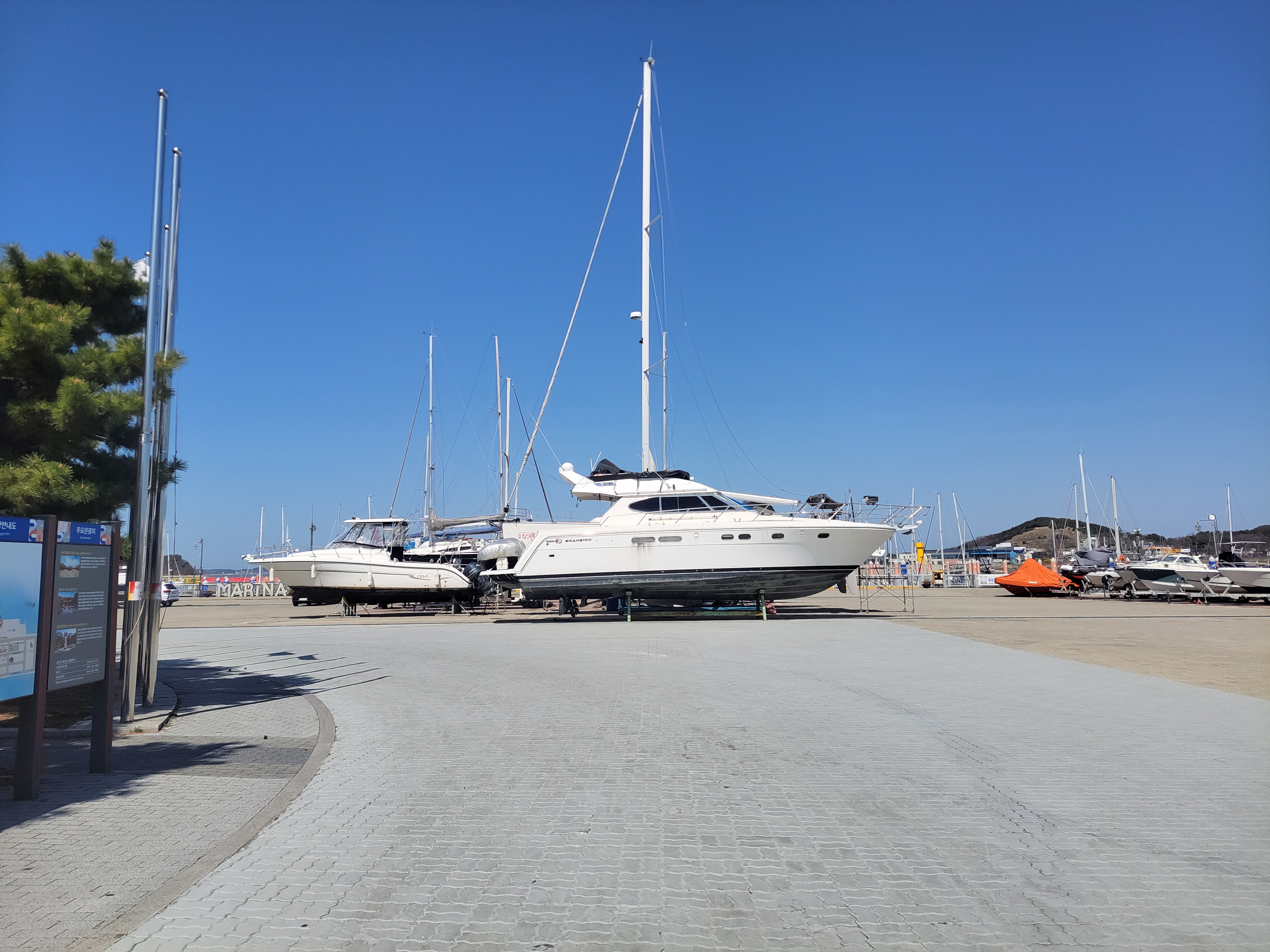 전곡항 마리나를 특별하게 만드는 핵심은 역시 요트입니다. 일반적인 항구에서는 쉽게 보기 어려운 대형 요트와 보트들이 정박하거나 육상 보관된 모습을 가까이에서 볼 수 있다는 점이 확실한 차별점입니다. 실제로 현장을 걸어보면 단순히 바다를 보는 장소가 아니라, 마리나 문화와 레저 보트의 분위기를 함께 느낄 수 있는 공간이라는 점이 분명하게 드러납니다.