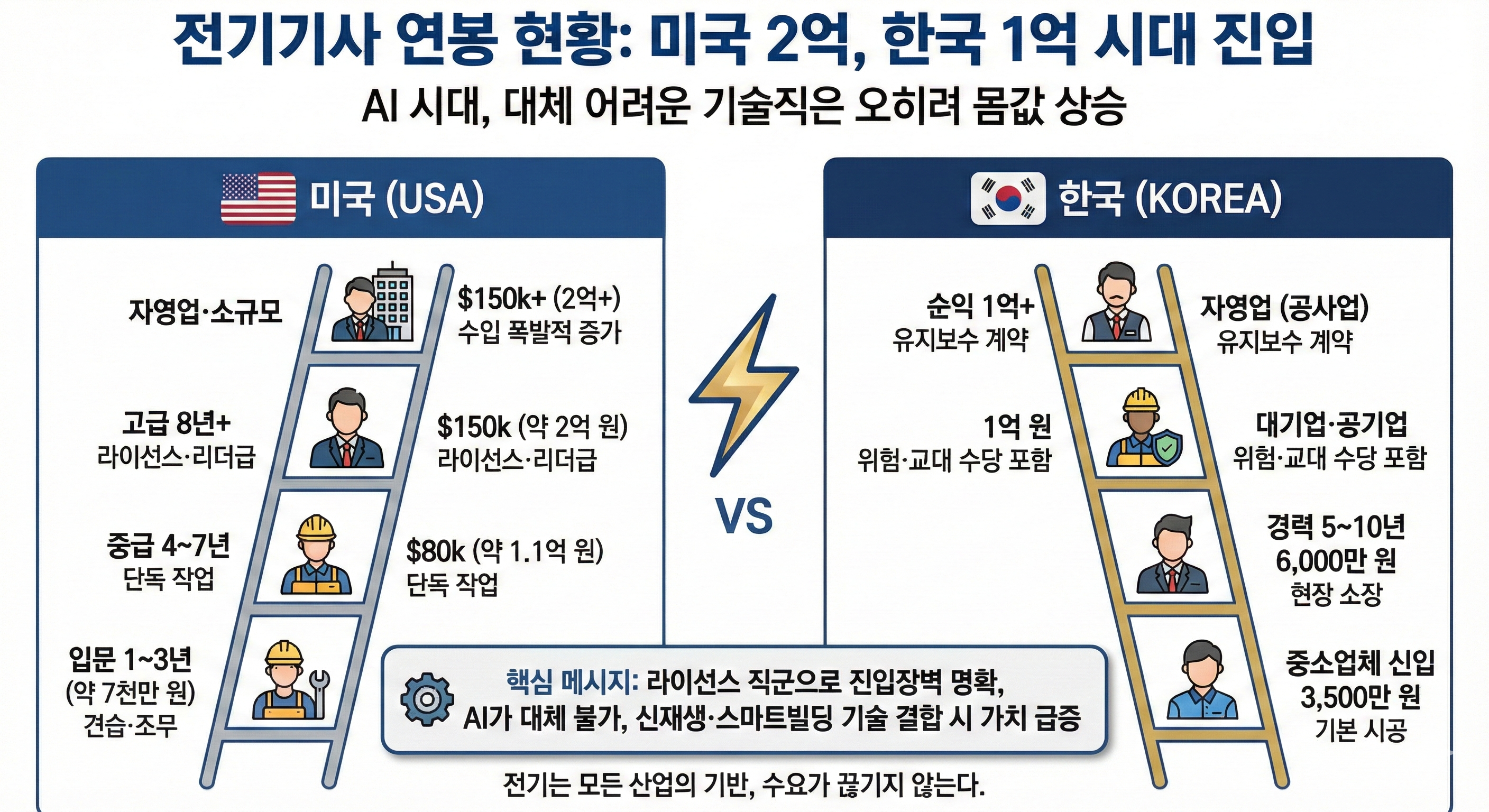신문 기사에서 언급된 것처럼, 미국에서는 일부 전기기사 연봉이 15만 달러(한화 약 2억 원) 수준까지 올라가 있습니다. 물론 모든 전기기사가 그렇게 받는 것은 아니고, 다음 요인에 따라 큰 차이가 납니다.