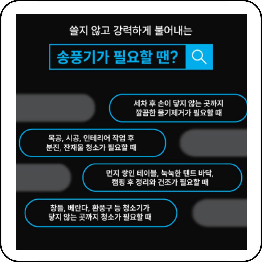 - 산업용 에어건처럼 강력한 바람까지는 아니에요. 생활 속 먼지 제거에는 충분하지만, 자동차 정비소 수준의 압력은 아닙니다.